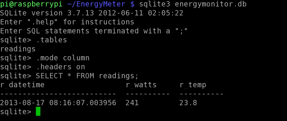 This then stores my energy monitor readings in a database called (unoriginally) "readings":