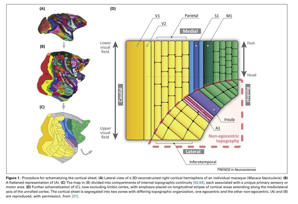 The two-dimensional cortical sheet of many mammals appears to have a common general topology. The input and output areas appear reasonably fixed, and are likely genetically determined. The visual, somatosensory and motor areas appear aligned. This may be what creates “embodied” intelligence; we think conceptually using a common co-ordinate system. For example, the half an image from the eyes is aligned bottom-to-top within the visual processing areas, which is aligned with the feet-to-head axis of the body as felt and the feet-to-head axis of the body as acted-upon (i.e. V1, S1 and M1 are aligned). This makes sense – it is more efficient to arrange our maps in this way.