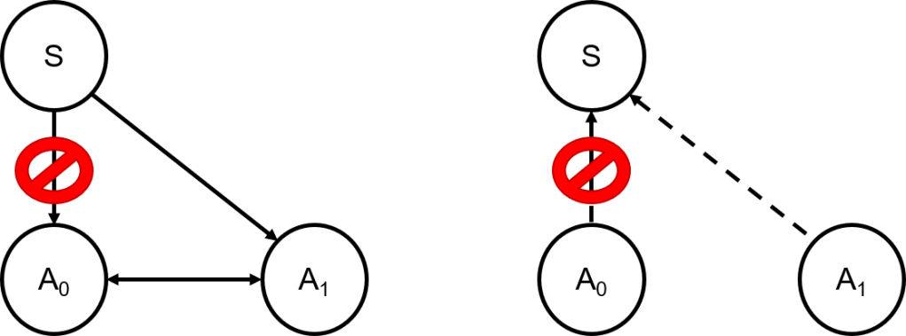 In our simple toy configuration, the action A is both a “collider” and a “fork” depending on the direction we are considering. The “fork” pattern provides for conditional independence on the “fork”; in our case, looking from A backwards, A is the “fork” and and