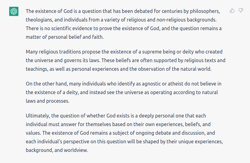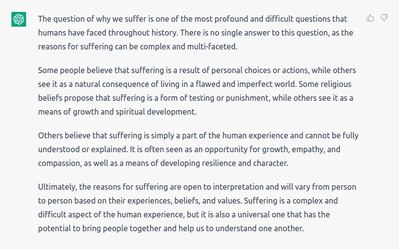 The answers to these question in combination seem to suggest that ChatGPT is being driven, or has learnt, to follow a rough template of a response. It has obviously been tweaked to avoid anything that could be politically charged. This however leads to answers that feel a little too washed out, with few tangible and useful elements. The process of averaging removes specific information.