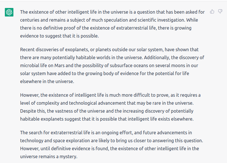 History indicates that when we use the term “intelligence” we mean exhibits behaviour similar to the dominant cultural norms. We think ChatGPT is clever and serve octopus as a starter. So the question we are really asking is – does life sufficiently similar to the physical and cultural context of the question asker exist? The answer to this is: it’s quite a bit less likely. This requires a match between two or more multi-billion year sequences of actions. We still can’t talk to magpies.