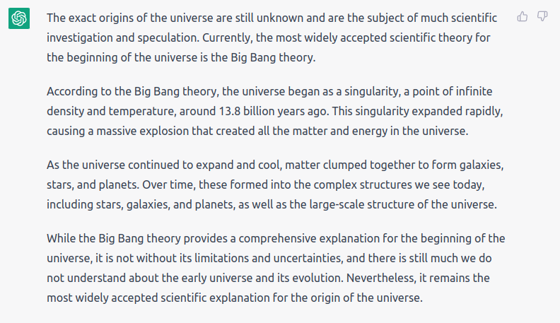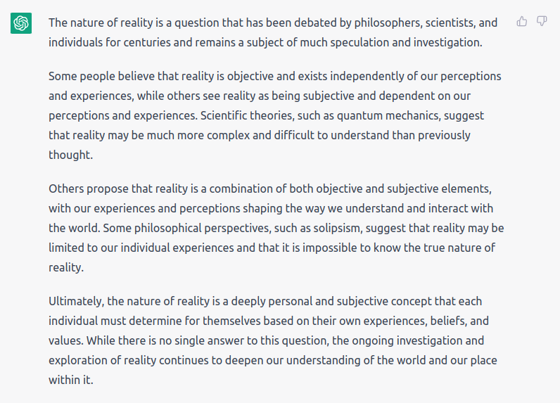 The answers to these question in combination seem to suggest that ChatGPT is being driven, or has learnt, to follow a rough template of a response. It has obviously been tweaked to avoid anything that could be politically charged. This however leads to answers that feel a little too washed out, with few tangible and useful elements. The process of averaging removes specific information.