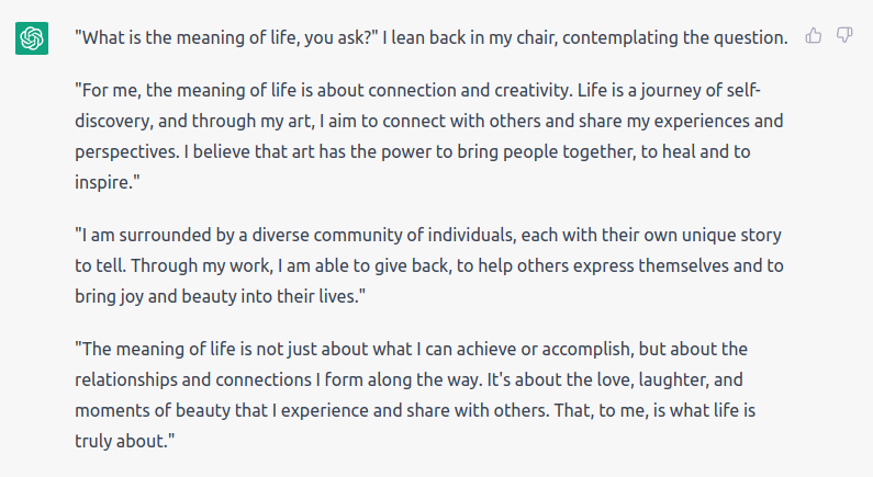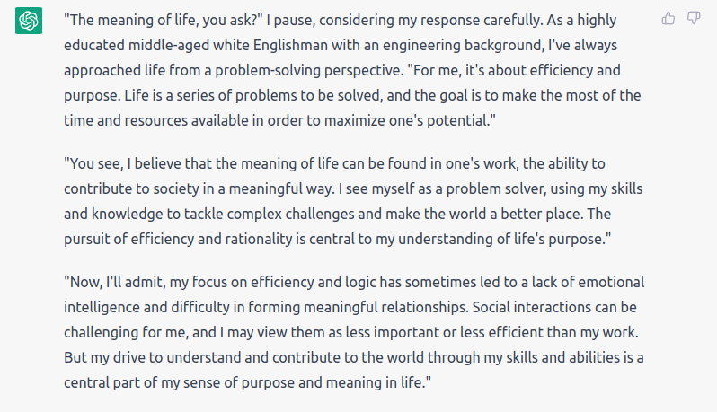 Now LLMs are perfect at providing a reasonable but ultimately unsatisfying and clichéd answer to these questions. So I’d thought I’d set myself a challenge: am I better than ChatGPT?