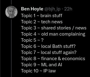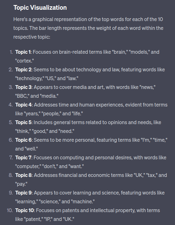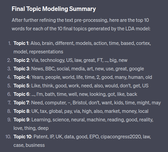 ChatGPT suggested LDA to perform topic modelling. This gave me confidence as I have a long history using Gensim to perform LDA in the pre-neural network days. (I was never much enamoured with LDA – the results seemed very token form dependent – the new sunny uplands of vector embeddings are much better.)