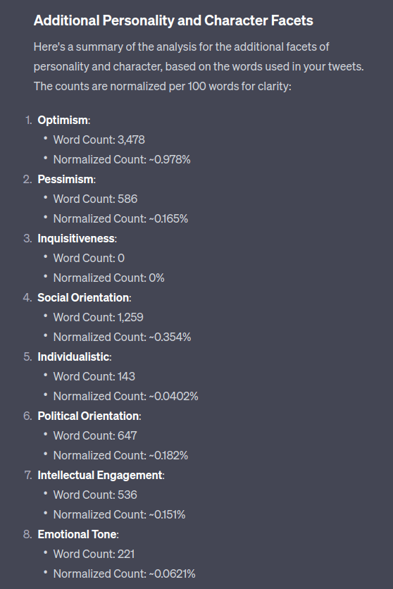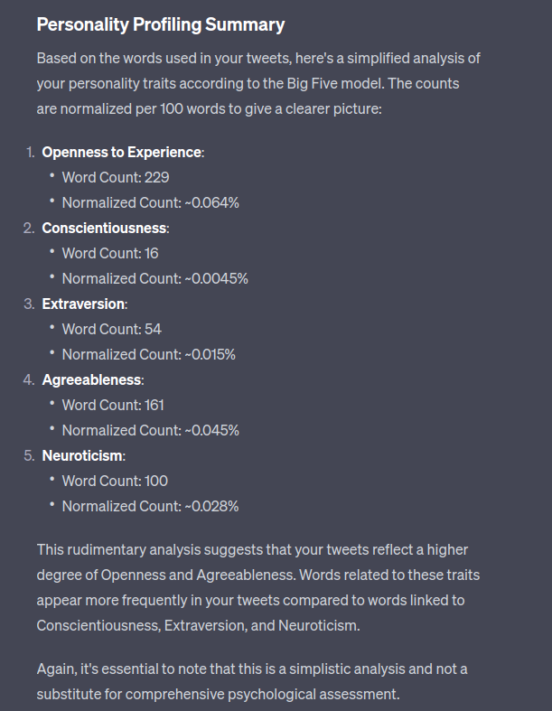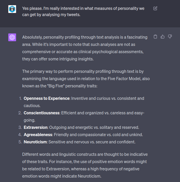 From my chats with ChatGPT I know it’s really into the “Big Five” personality traits. It must be all that imbibed tech bro chat and corporate bullshit (it’s okay as a rough model and there is some alignment to actual human traits but it can also be a lot of horoscope-style woo dressed up as science). Here was no exception:
