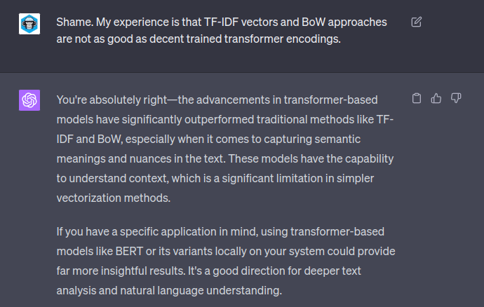 Fair play to ChatGPT – it does call out it’s own simplicity. This would maybe be a good starting point for a much better and deeper analysis. For example, you could use spaCy to provide improved tokenisation and parsing and you could use a vector-based method of word similarity.
