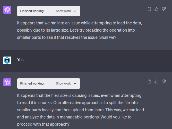 Another warning: ChatGPT is sometimes an unreliable narrator. It would often say “I cannot run this code because X” and I would look at the error message and it would actually be because of Y. If you then steer ChatGPT to fix Y, things would work. If you let ChatGPT fix the error itself, it would often be lost down rabbit-holes trying to fix non-error X.