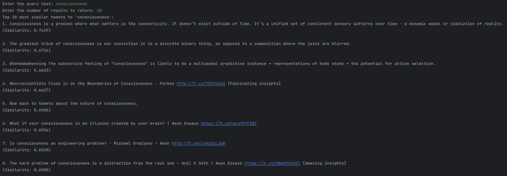 Once we encoded the tweets with the SentenceTansformer, it was easy to put together a simple script to run a vector query on the tweet archive.