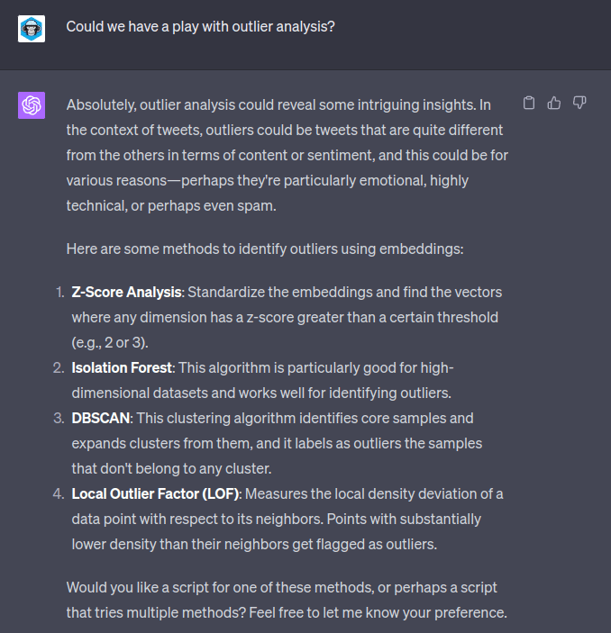 I tried to ask ChatGPT to do some analysis based on vector embeddings. It turns out this is a step too far for the sandbox environment (fair play).