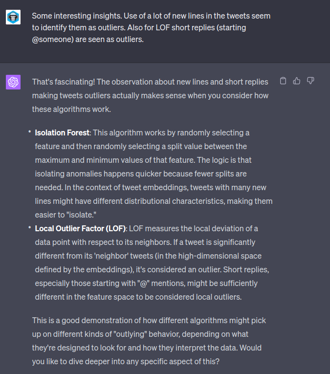 This seemed a little ropey with the returned data. It seemed to be led a lot by the surface form of the text – tweets with newlines or “@replies” seemed to be often classed as “outliers”: