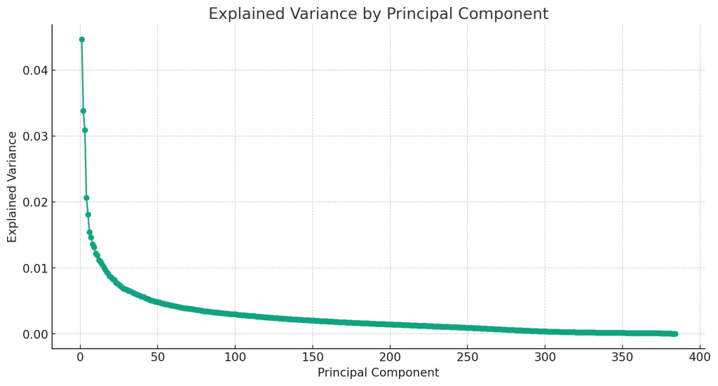 We also tried some PCA dimensionality reduction on the embeddings. This produced some cool power law curves: