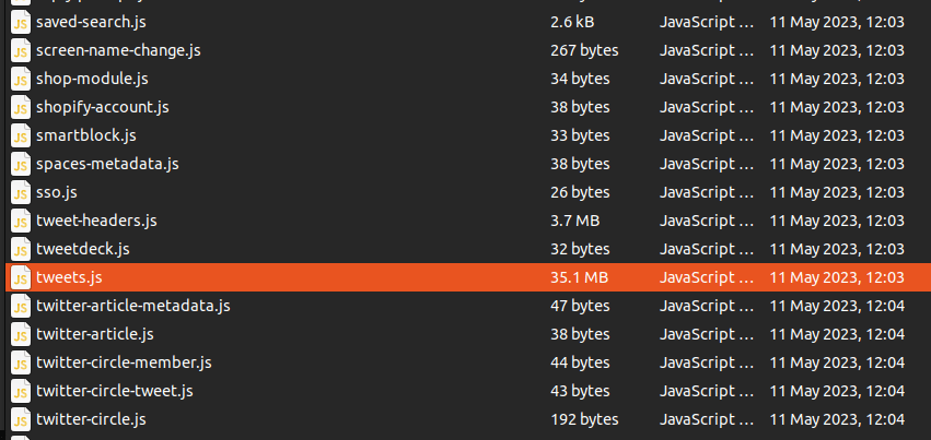The data folder contains all your Twitter data as JSON files. There’s a lot in here and all your posted media is also included. For this analysis we will just use the tweets.js file within the data folder. This contains the actual tweet data (without associated media). It is also a reasonable size. My file contained data for around 23,436 tweets.