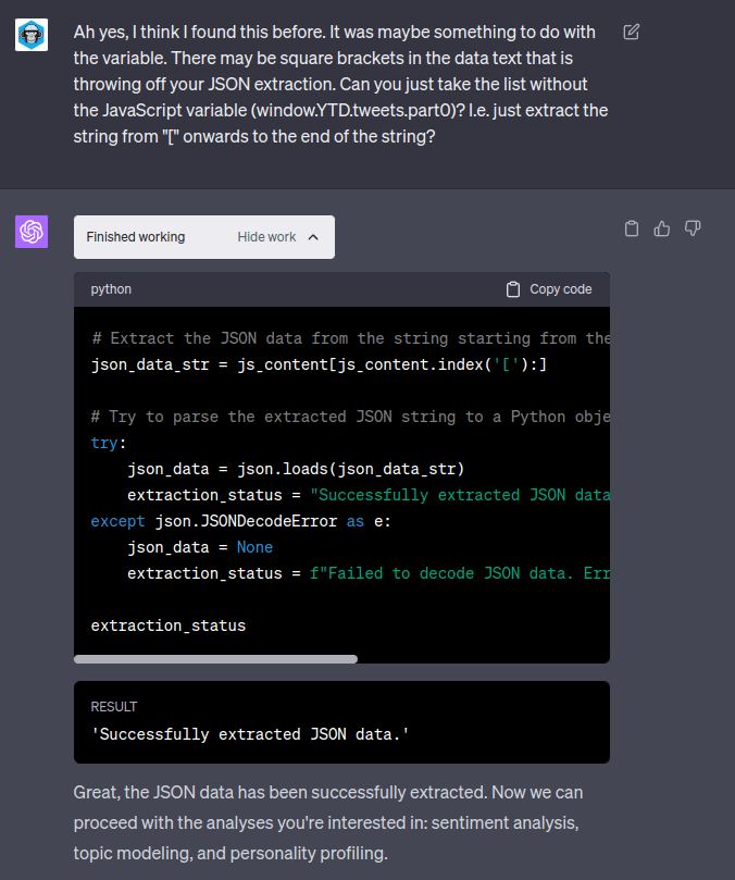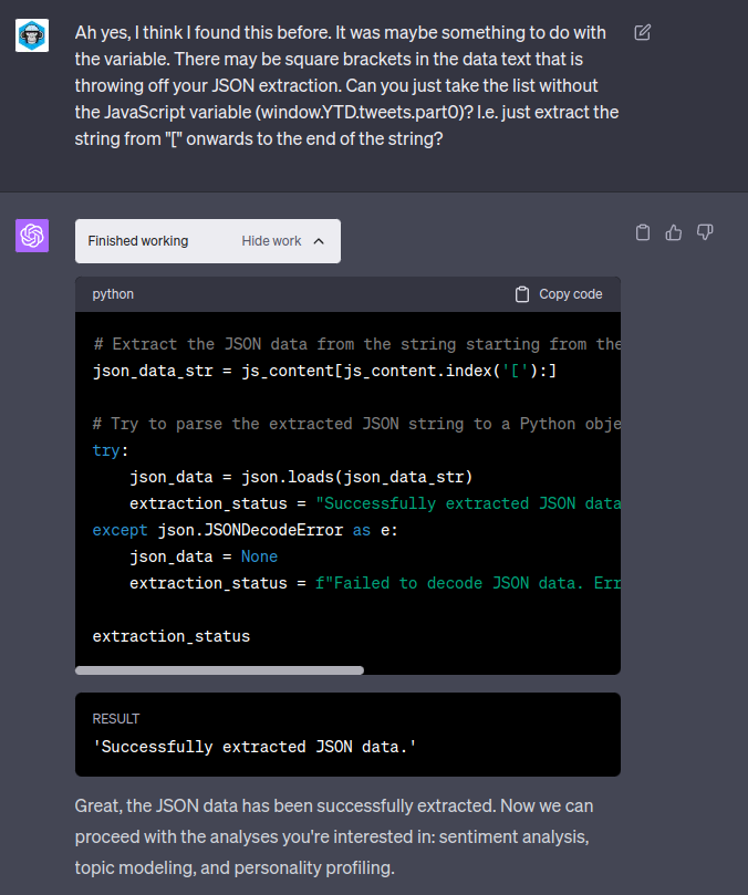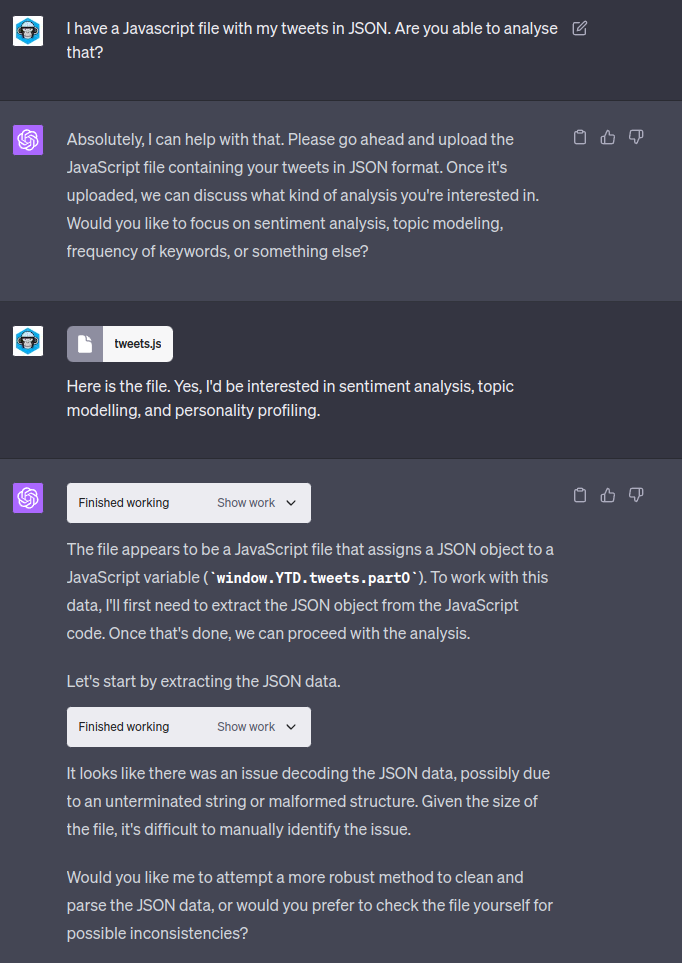 I started by just naively uploading the tweets.js file and asking ChatGPT to analyse it.