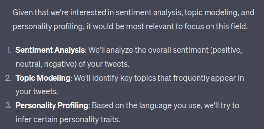 Based on some back-and-forth with ChatGPT, I decided to start by looking at sentiment analysis, topic modelling, and personality profiling.