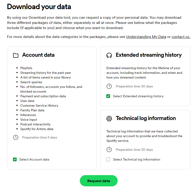 Scroll down to the bottom of the “Privacy settings” page and you’ll see a “Download your data” option. I requested both the “Account data” and the “Extended streaming history”.
