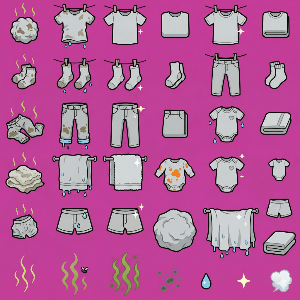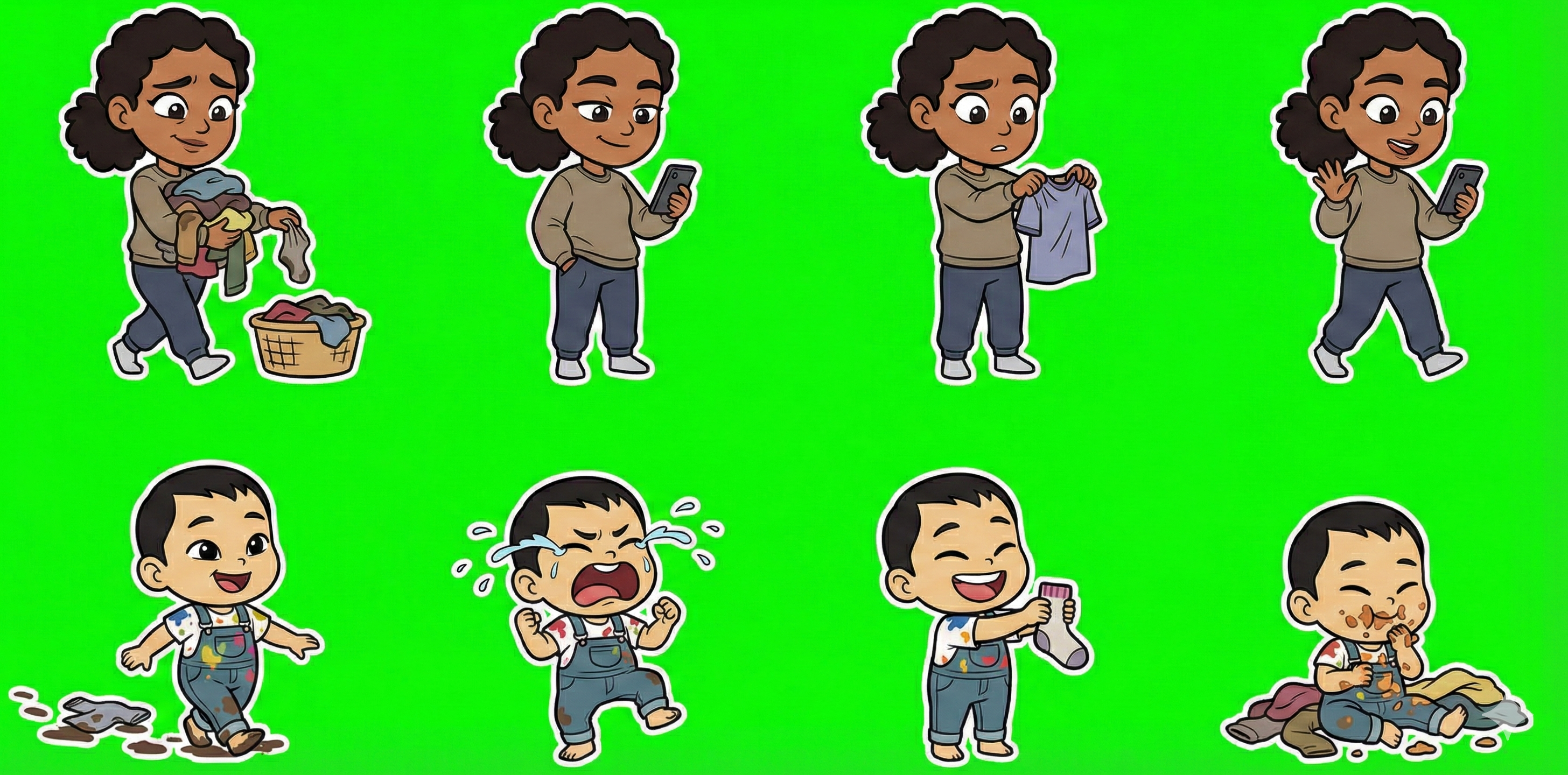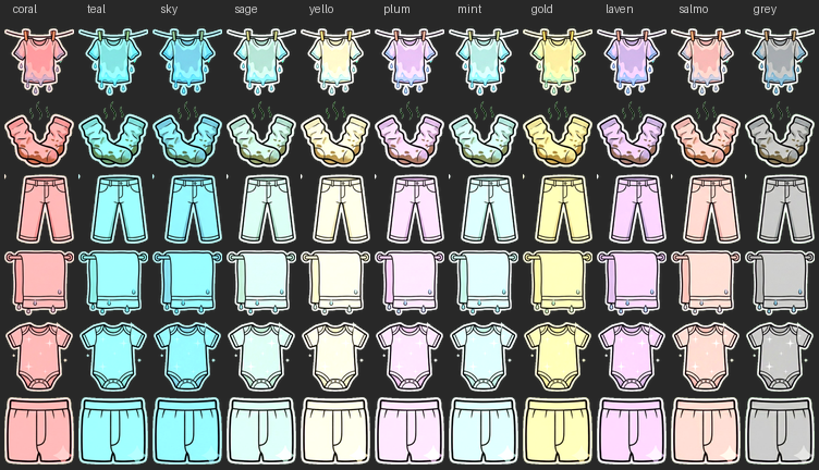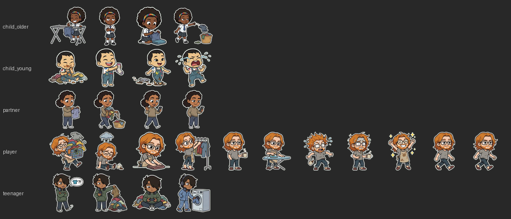 We wanted to create a full set of 2D cartoon sprites for a casual mobile game — clothing items in multiple states (dirty, hanging, drying, folded) and character sprites with various poses. The sprites needed transparent backgrounds so they could be composited over game backgrounds, and clothing sprites needed to be tintable to different colors at runtime.