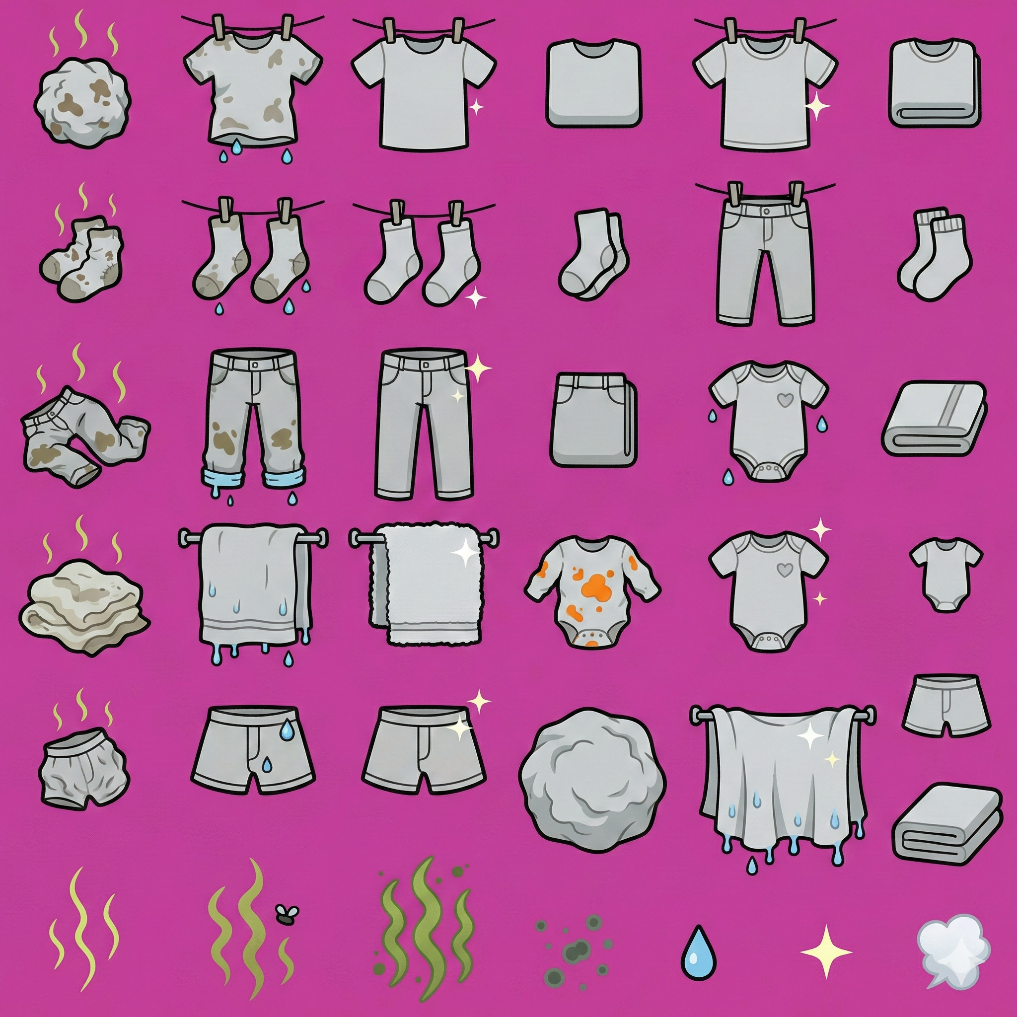 - Be extremely specific about each sprite position. “Row 1, left to right: dirty crumpled t-shirt with brown stains and stink lines; wet t-shirt hanging on clothesline with clothespins and water droplets; …” is better than “t-shirt in various states.”