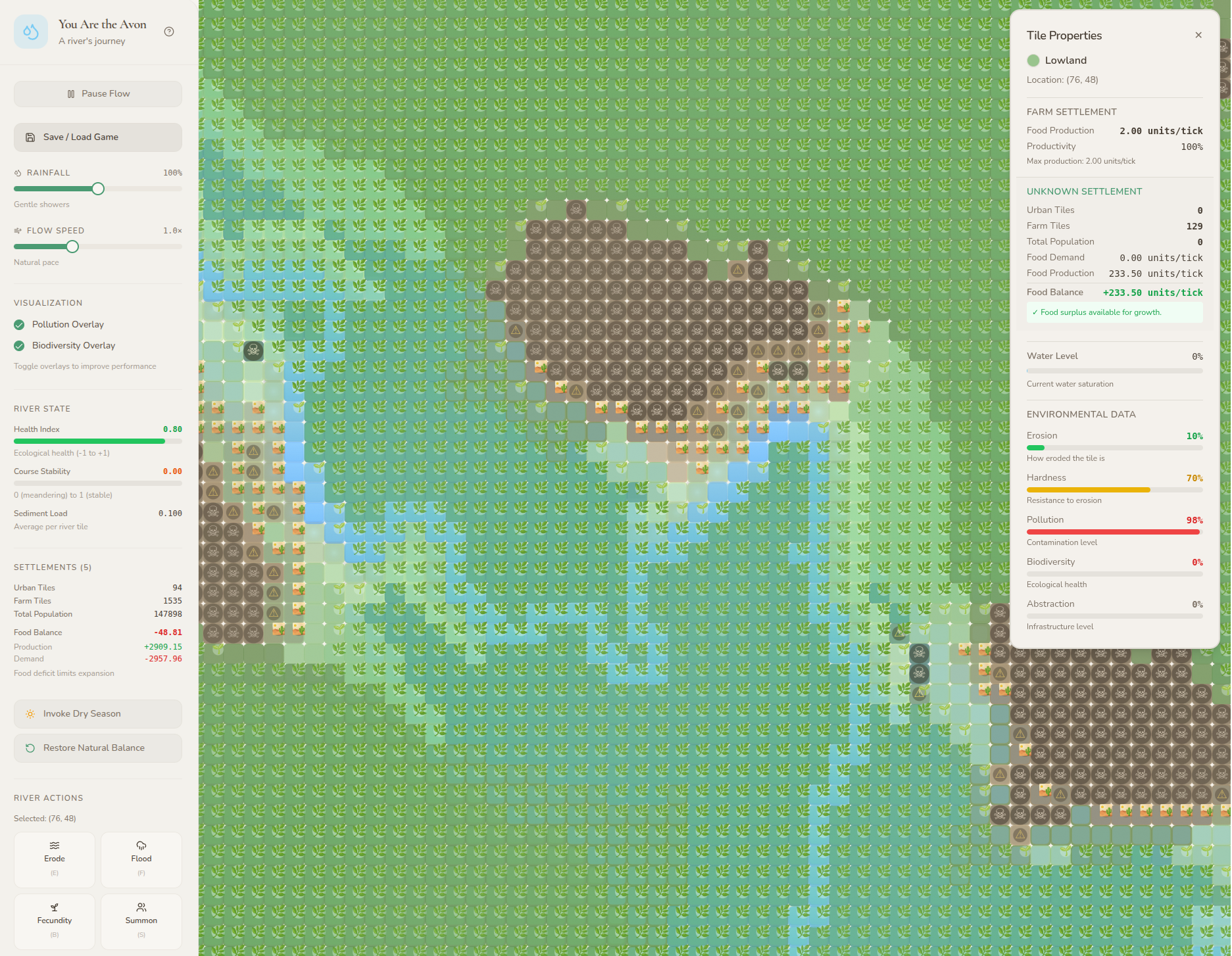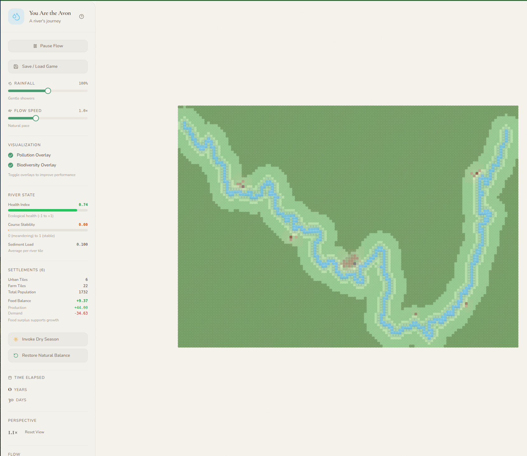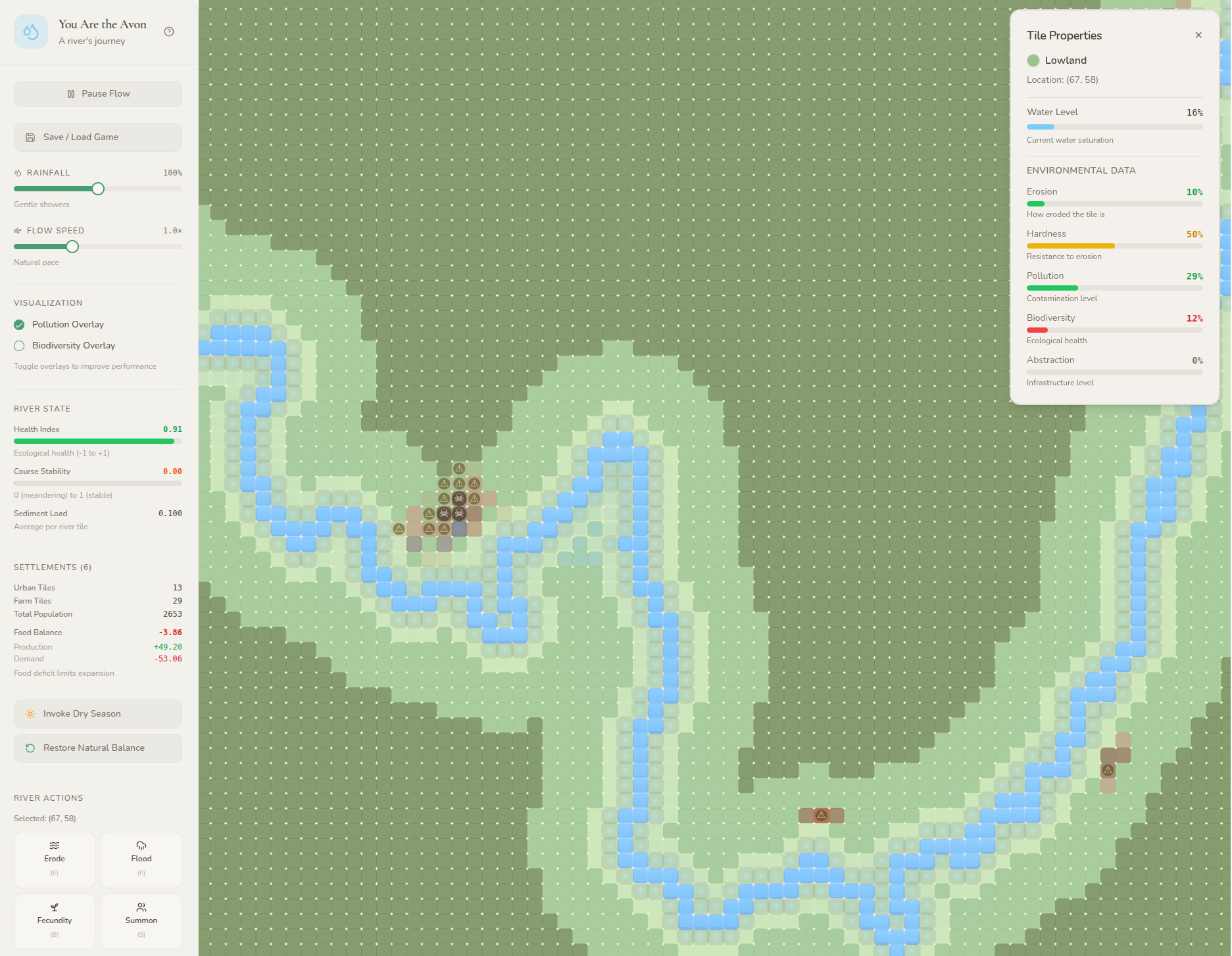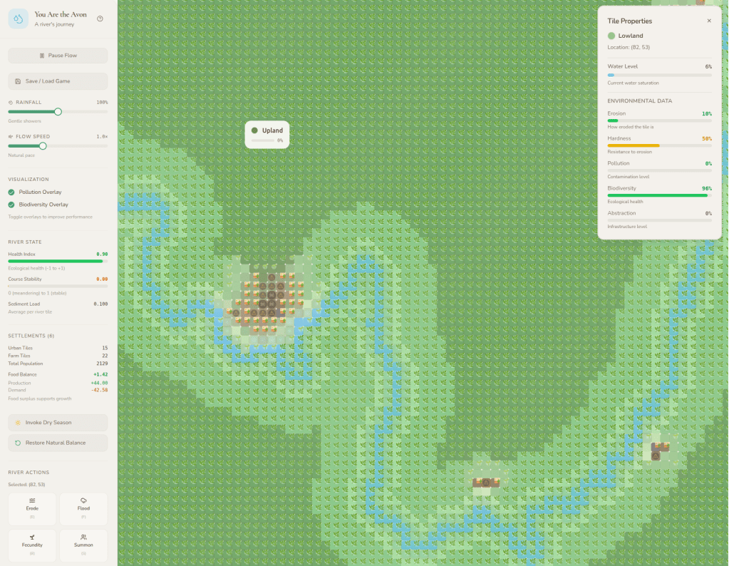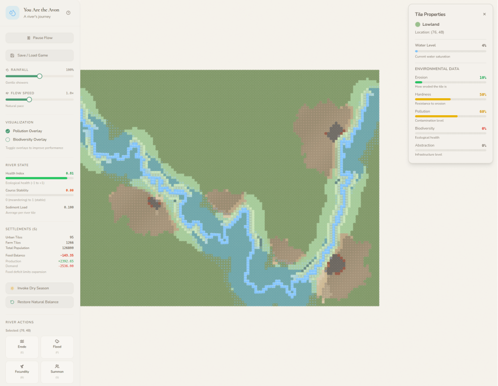 Thinking of ways to get people to engage with the Bristol Avon ecosystem. Ended up being a cross between SimCity and Game of Life. Processed accurate river data to build the tile map. Added towns and cities – Bristol, Keynsham, Bath, Bradford-upon-Avon, Melksham and Chippenham.